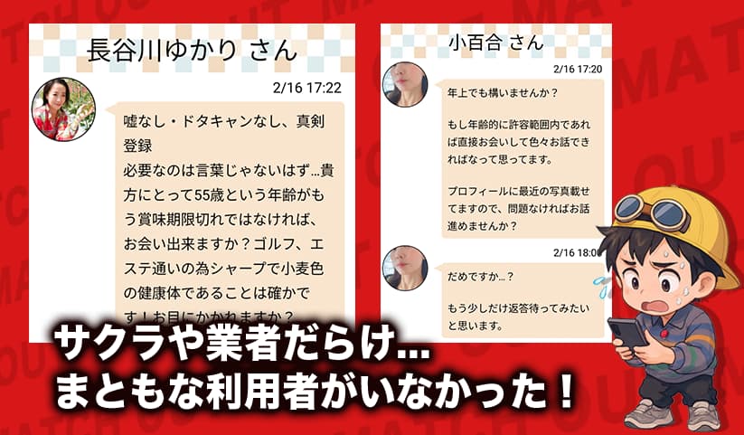 サクラや業者だらけの可能性があり、ロマンス詐欺や美人局、外部誘導などのトラブルに繋がるおそれもあります。
