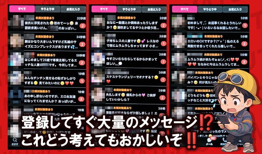 - 登録直後から大量メッセージが届き、普通の出会いとは考えにくい