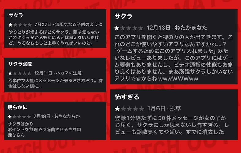 実際、App Storeの低評価レビューも、サクラについてのものや、紹介内容との違いについての声が多かったぞ。