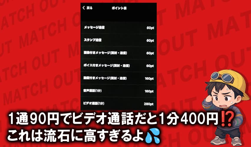 一般的な出会い系なら、メッセージ1通50円前後、通話機能があってもここまで高くなることは少ないんだよ。
