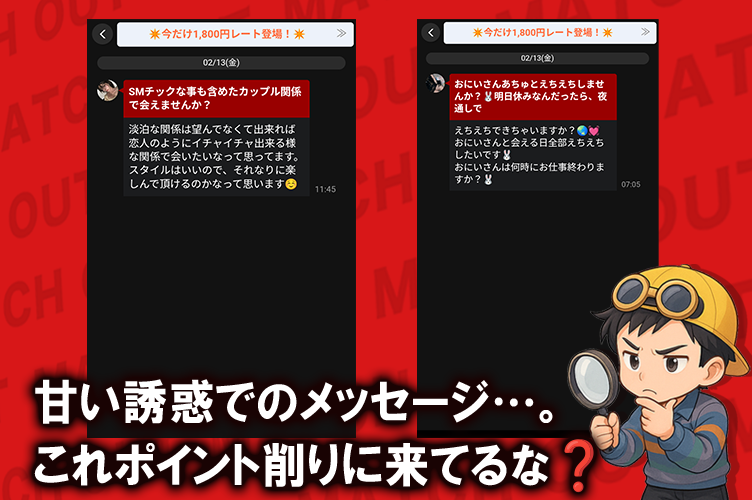 登録直後にエロいメッセージが一気に来た時点で違和感あったんですよね。この記事読んで、やっぱりか…って納得しました。