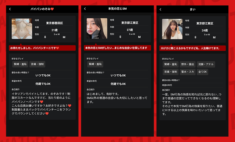 紹介ページを見る限り、「SMマッチングコミュニティ」「本能を解放する出会い」みたいな刺激的な言葉がかなり前面に出ているね。