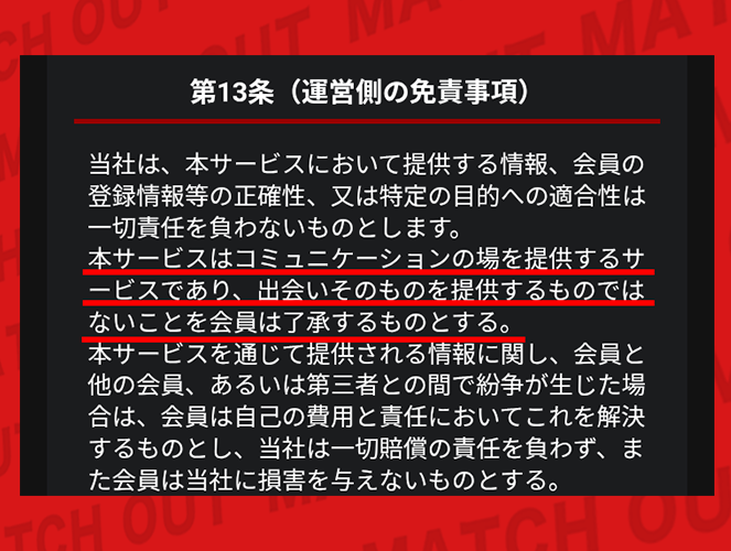 特に気になったのが、利用規約にある「コミュニケーションの場を提供するだけで、出会いそのものを保証しない」という内容なんだよな。