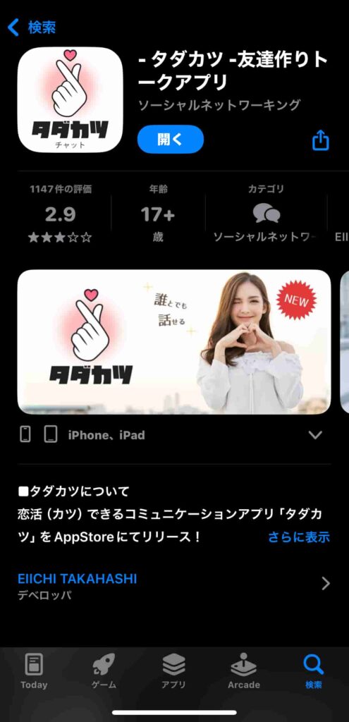 タダカツは、GooglePlayで配信されている完全無料の友達作りアプリとして紹介されています。