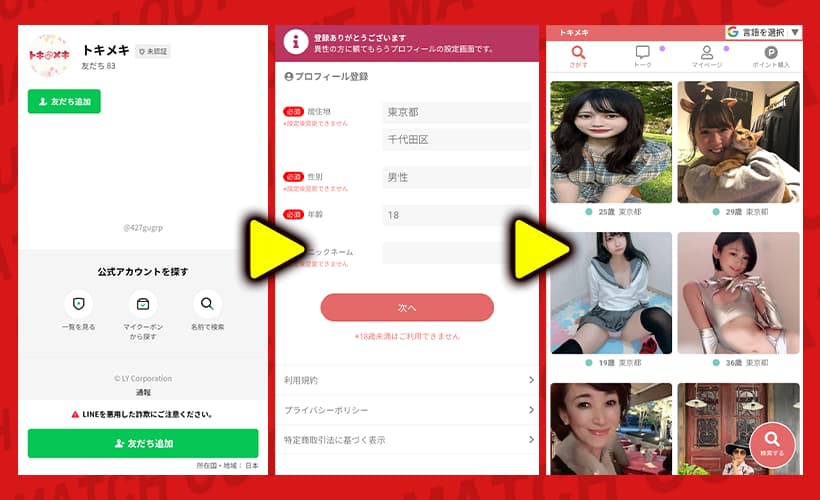 トキメキは、LINEやメールアドレスから登録できる、いわゆるLINE出会い系サービスだな。
